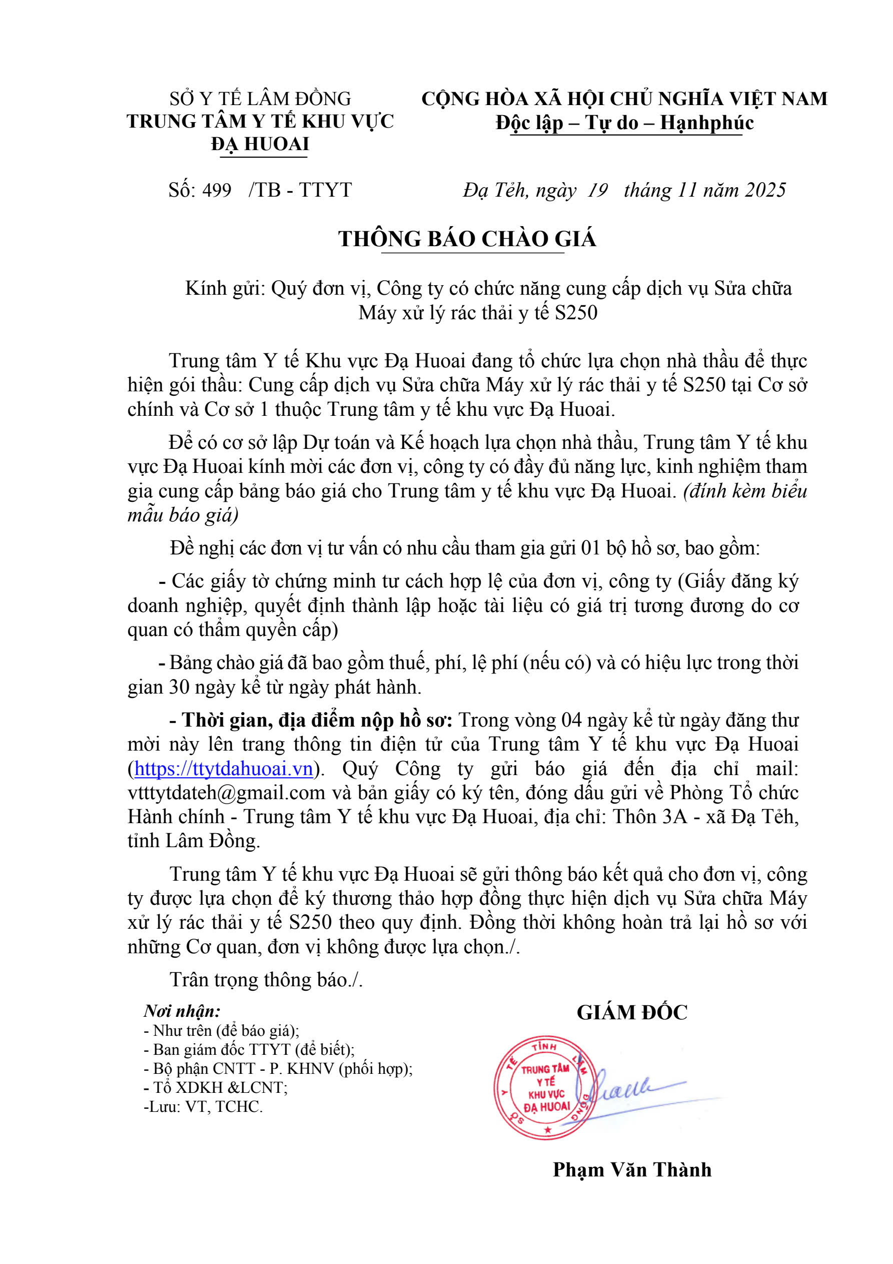 Thông báo mời chào giá gói thầu Cung cấp dịch vụ sửa chữa Máy xử lý rác thải y tế S250