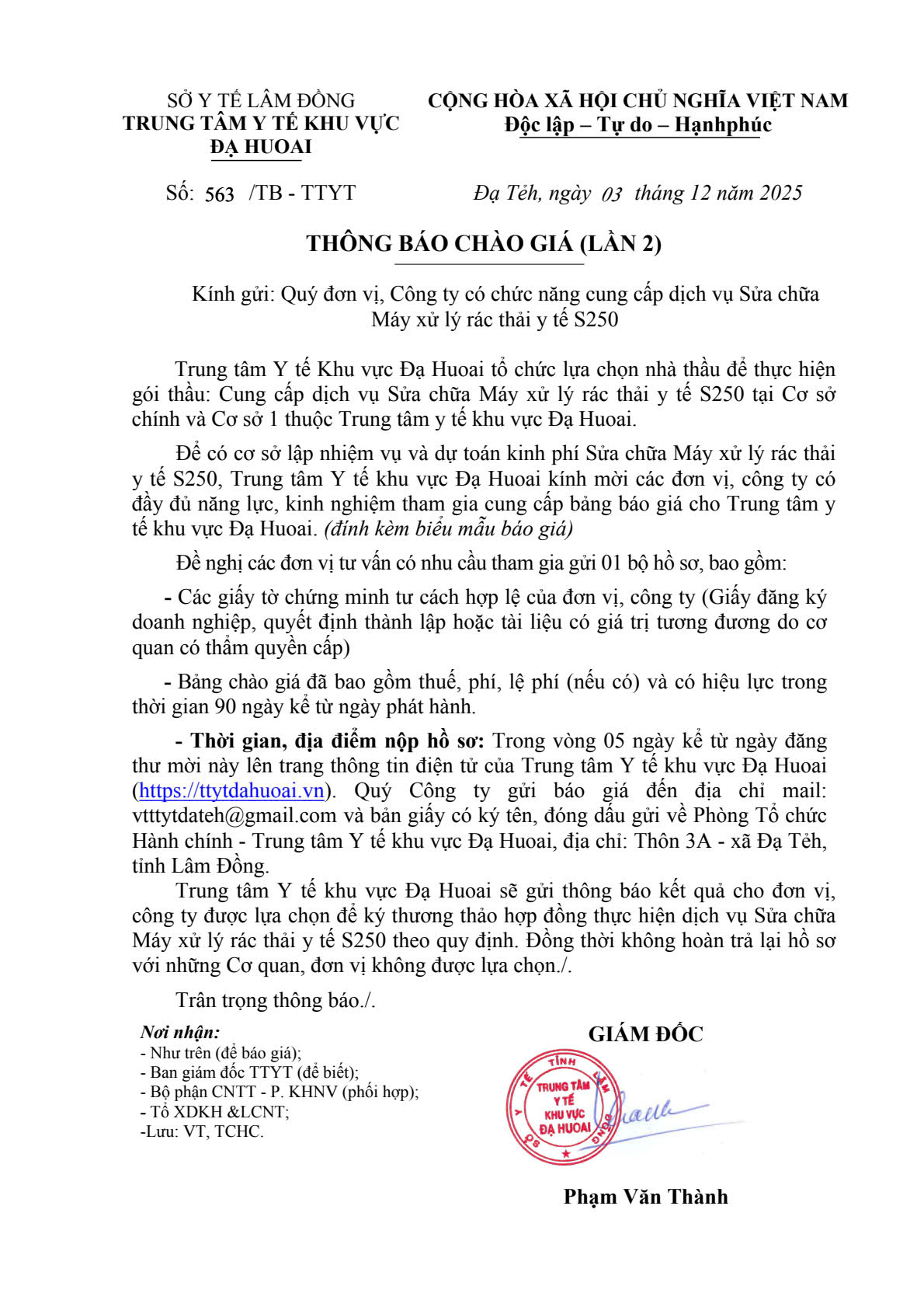 Thông báo mời chào giá (lần 2) gói thầu sửa chữa máy xử lý rác thải y tế