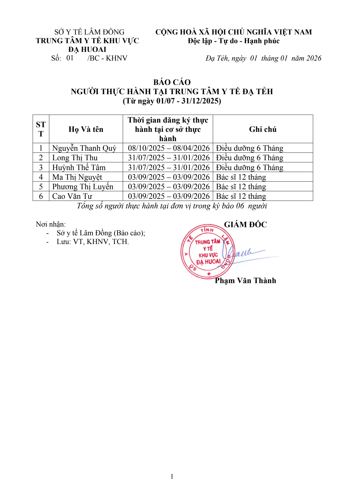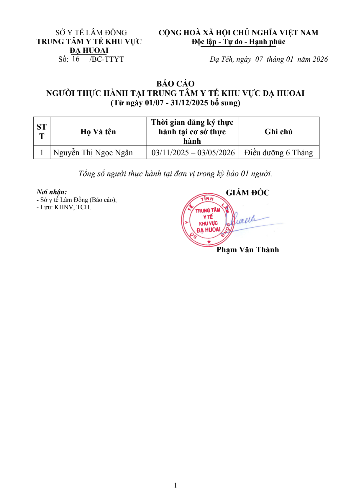 Thông báo người thực hành tại Trung tâm Y tế khu vực Đạ Huoai
